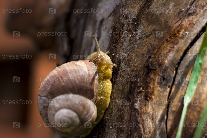 Крупные белые улитки-моллюски с коричневой полосатой раковиной, ползающие по камням на солнце. Улитка крупным планом в естественной среде,