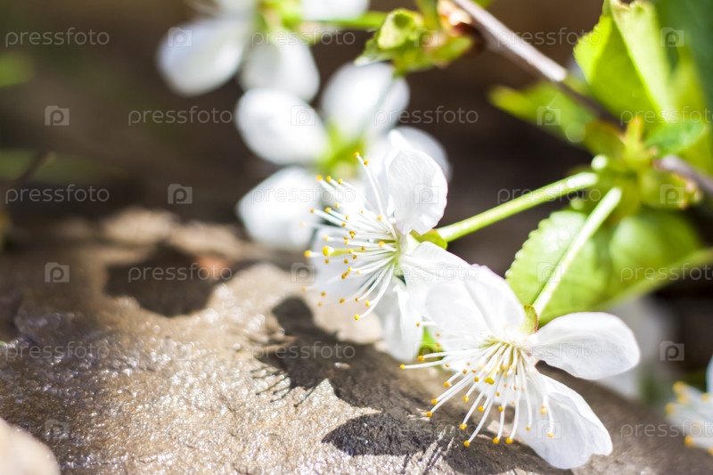 Ветка с белыми цветами на фоне камней. Цветы вишневого дерева. Макросъемка цветочных бутонов. Выборочный фокус