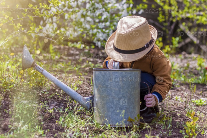 Симпатичный маленький мальчик в шляпе и резиновых сапогах поливает растения лейкой в саду. Очаровательный малыш помогает своим родителям выращивать овощи