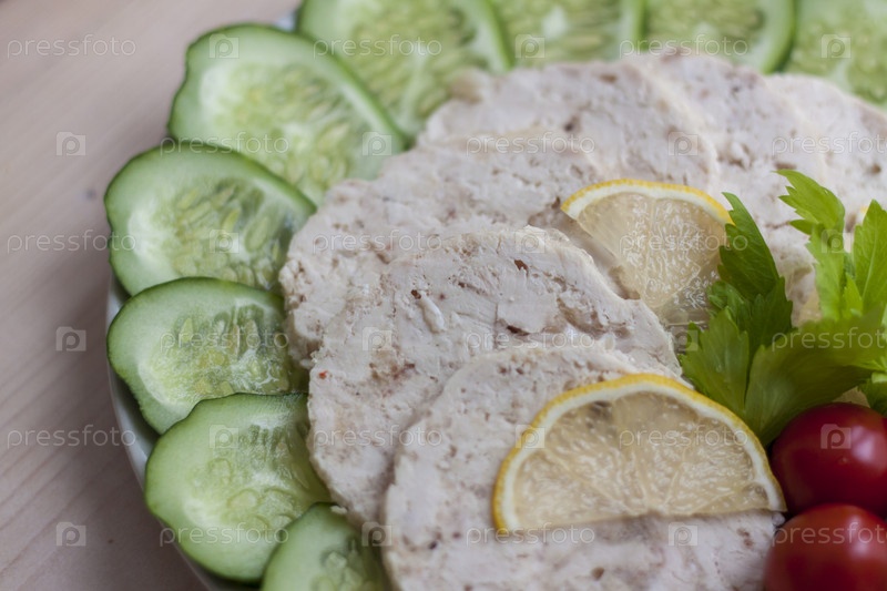 Мясо запеченной курицы нарезать ломтиками. Ломтики запеченного куриного мяса выкладываются на тарелку вместе с огурцом и помидорами черри