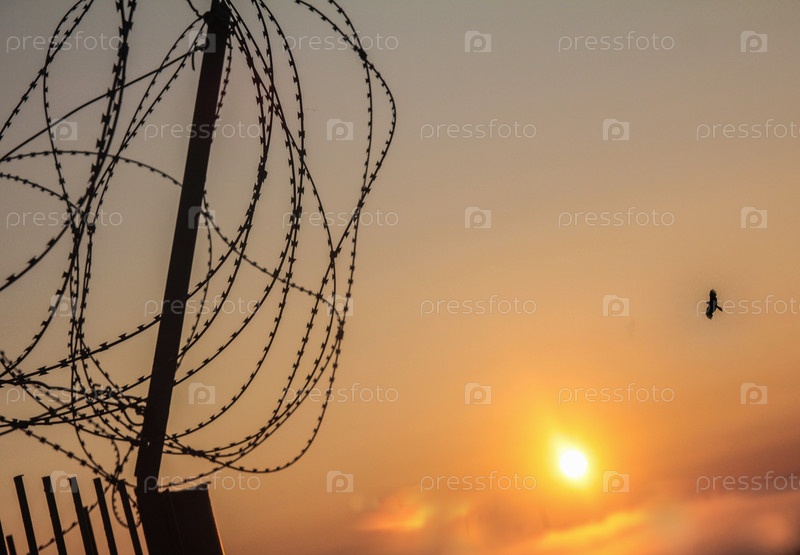 Утренний рассвет над колючей проволокой и летящей птицей на заднем плане