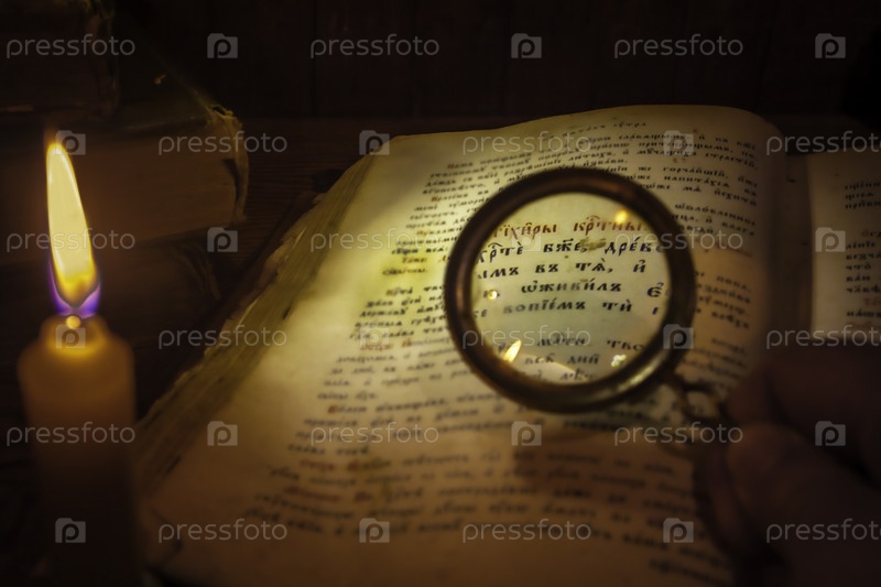 Прочитайте древний текст развернутого фолианта через увеличительное стекло при свете восковой свечи