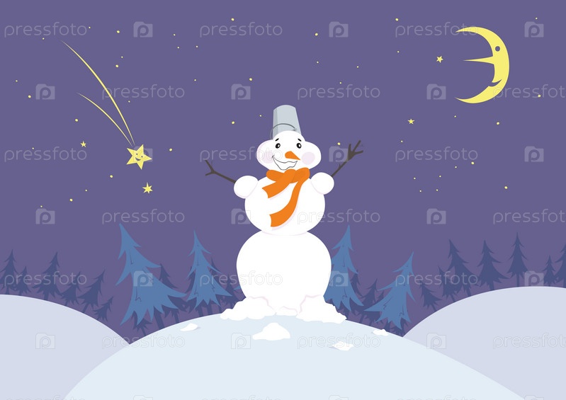Забавный мультяшный снеговик в лесу ночью