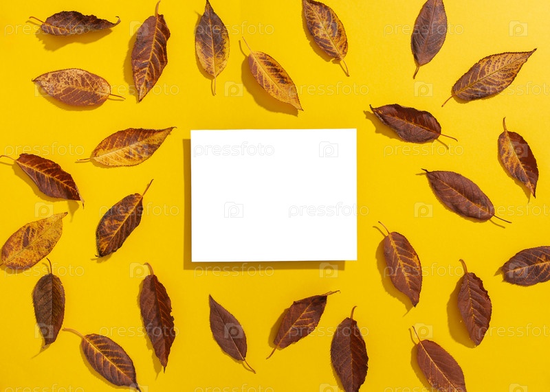 Пустая приподнятая прямоугольная рамка макет и осенние листья на желтом фоне