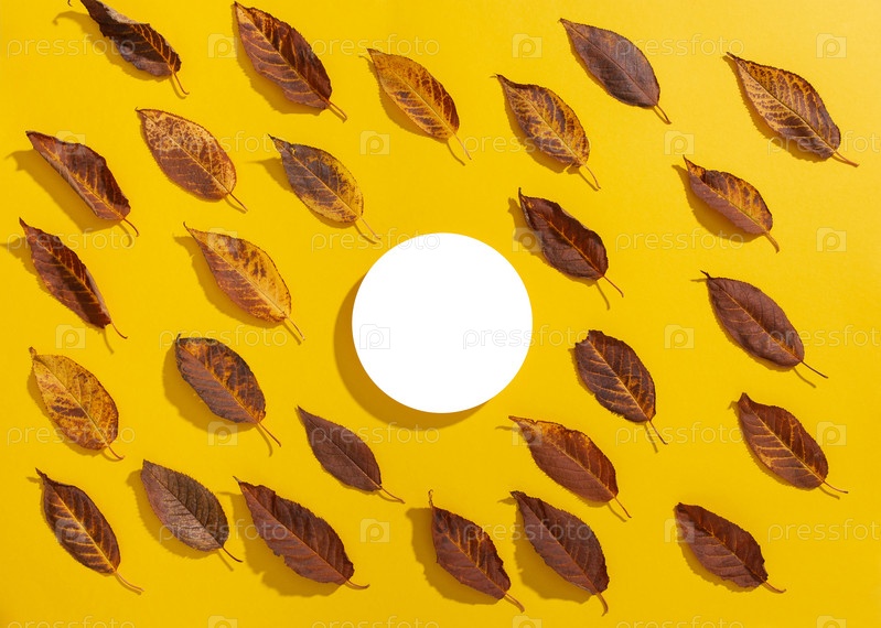 Пустая приподнятая круглая рамка макет и осенние листья на желтом фоне