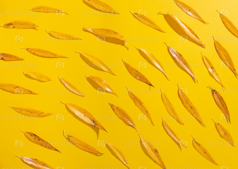 Креативный макет из сухих осенних листьев ивы на желтом фоне