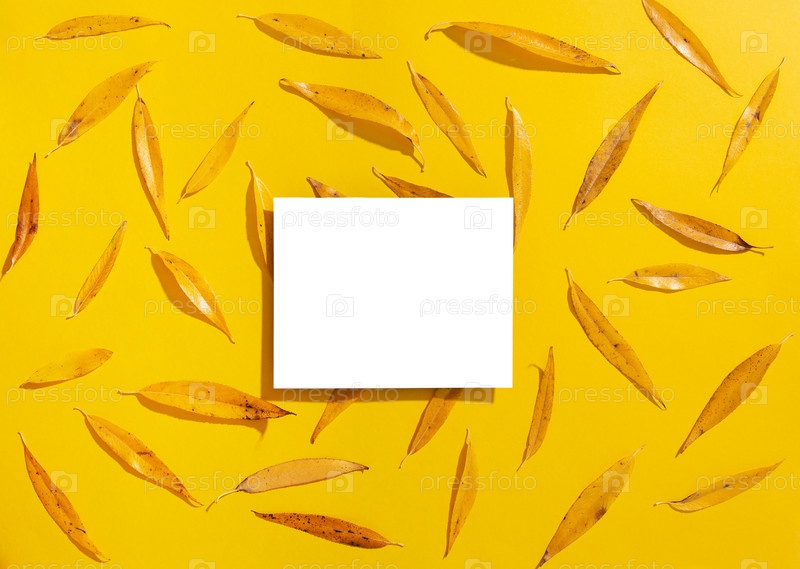 Пустая приподнятая прямоугольная рамка макет и осенние листья ивы на желтом фоне