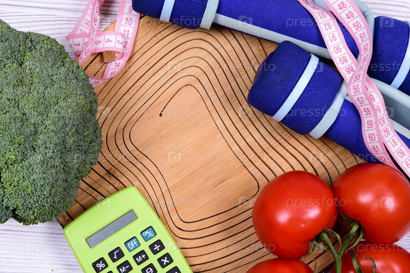 Помидоры, брокколи, калькулятор и гантели на деревянном фоне