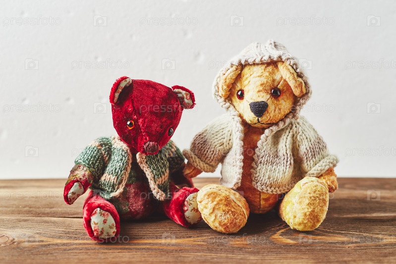 Два плюшевых мишки на деревянном фоне