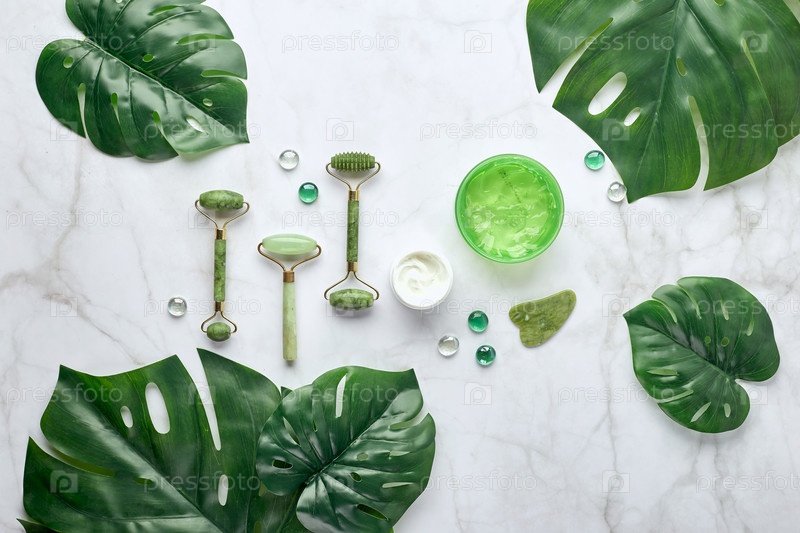 Косметические средства по уходу за кожей, массажер для лица с нефритовым камнем, кремы, гель и масло. Роликовый массаж лица. Плоская планировка, вид сверху