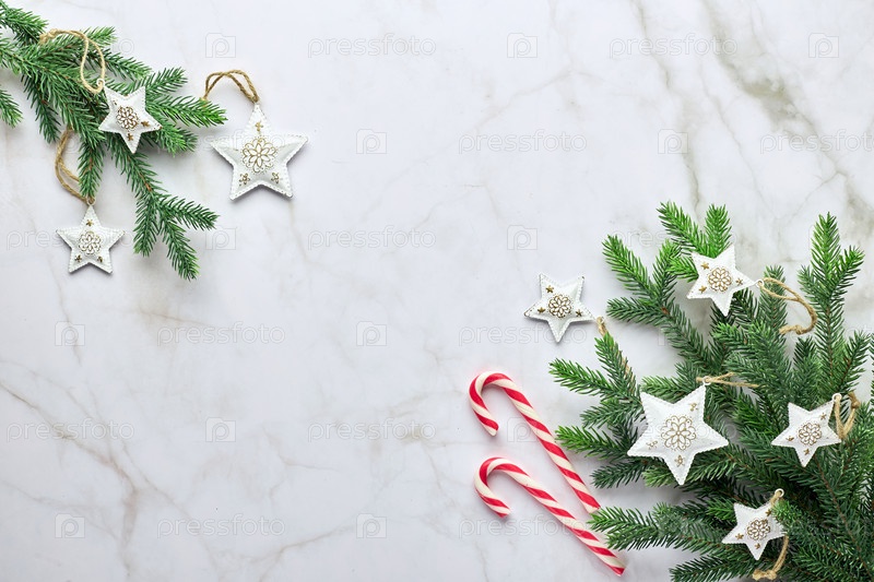 Новогодний фон с елкой и декоративными украшениями в виде звезд. Плоская планировка, вид сверху