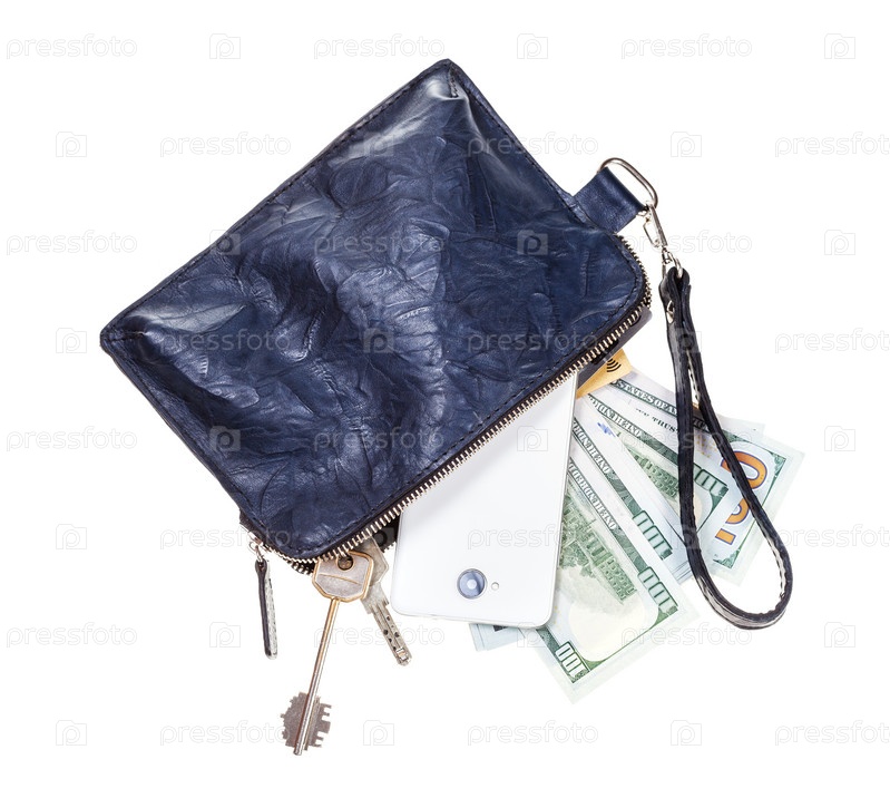 Кошелек с телефоном, ключами, картами и изолированными долларами