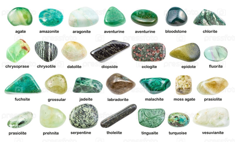 Набор различных зеленых драгоценных камней с изолированными именами