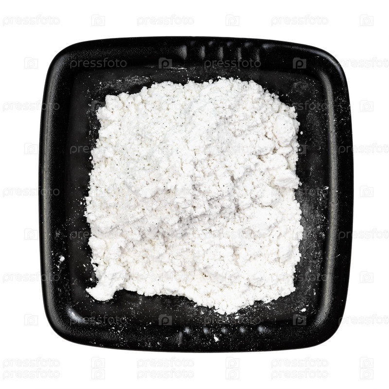 Вид сверху на ванильный сахар в черной миске изолирован