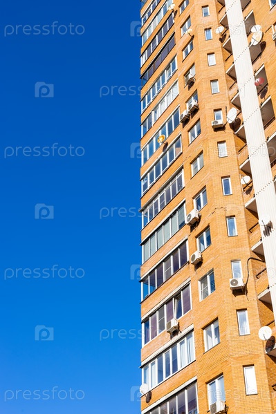 Многоэтажный кирпичный жилой дом и голубое небо