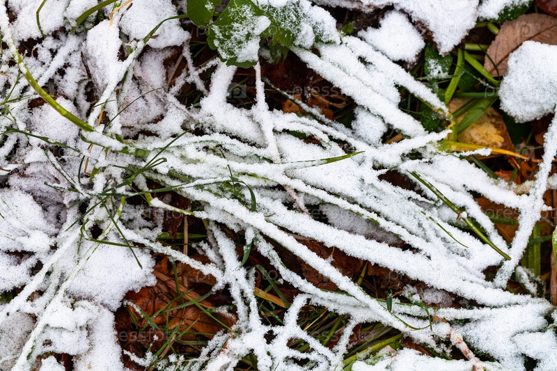 Первый снег покрывает зеленую траву на лугу
