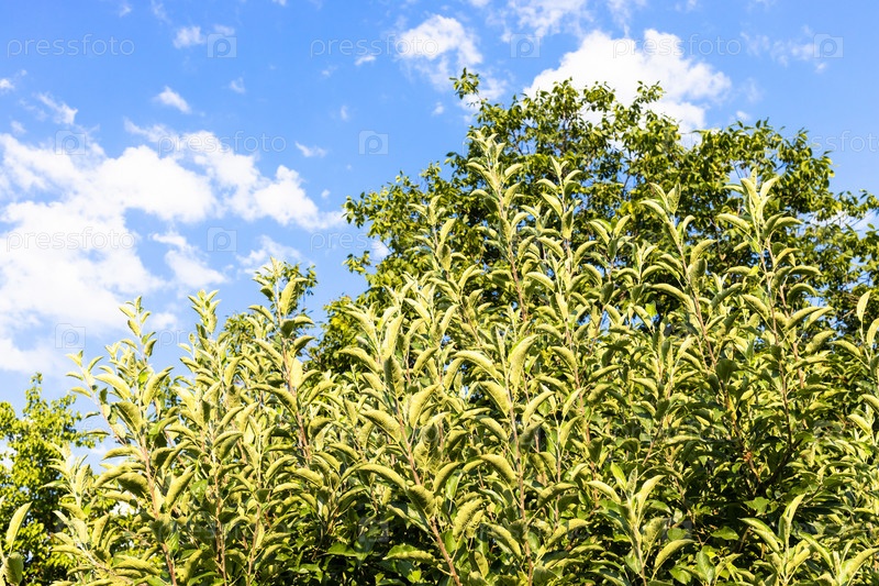 Зеленые фруктовые деревья, освещенные вечерним солнцем и голубым небом