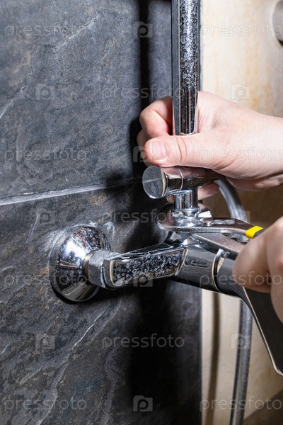 Сантехник ремонтирует старый смеситель для душа на кафельной стене