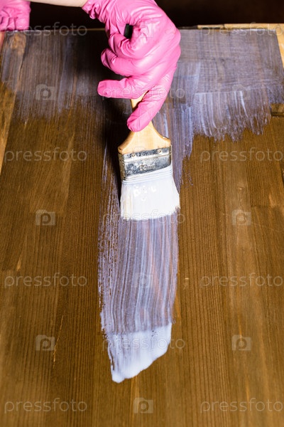 Вручную лакирует мебельный щит, окрашенный в коричневый цвет