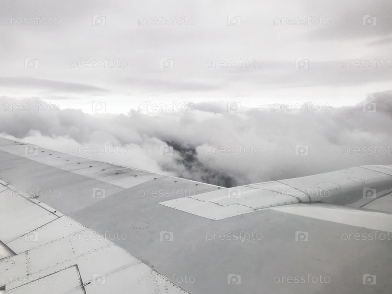 Вид на крыло самолета над серыми облаками вечером