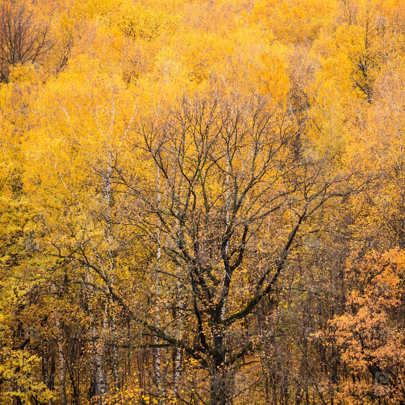 Черный дуб в окружении сочных осенних листьев