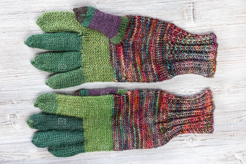 Ладонь вязаных шерстяных перчаток ручной работы на сером