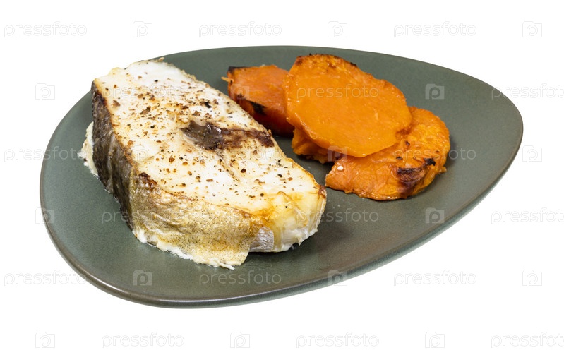 Стейк из запеченной трески с ломтиками отварного батата