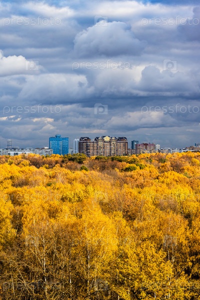 Желтый лес, современные многоэтажные дома на горизонте