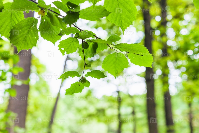 Орешник с зелеными листьями и размытым лесом