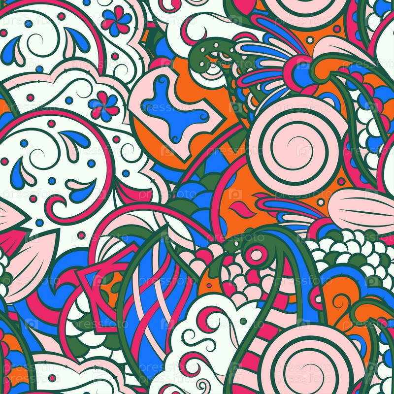 Ажурный бесшовный узор. Менди дизайн. 7 цветов. Этническая текстура каракулей. Изогнутый рисунок фона. Вектор