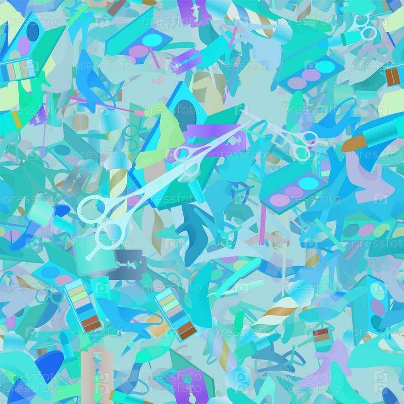 Фоновый узор абстрактный бесшовный дизайн текстуры. Тема о прическах, помаде, каблуках на платформе