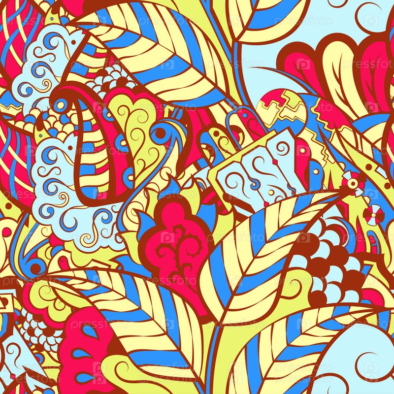 Ажурный бесшовный узор. Менди дизайн. 6 цветов. Этническая текстура каракулей. Изогнутый рисунок фона. Вектор