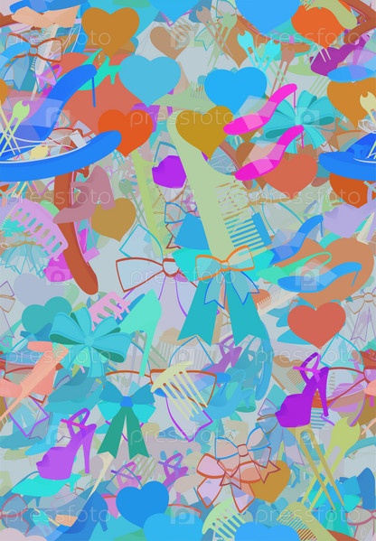 Фоновый узор абстрактный бесшовный дизайн текстуры. Тема о прическе, сердцах, лентах, туфлях, обуви
