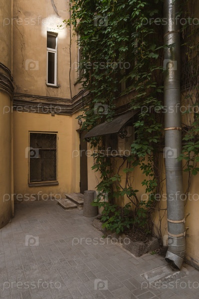 Водосточная труба и плющ во дворе Петербурга