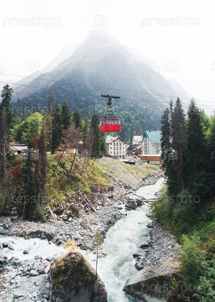 Красный вагон на канатной дороге в горах. Горный пейзаж с рекой