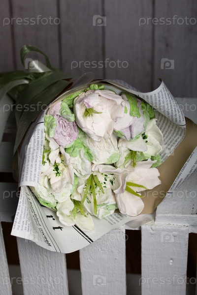 Зефирный букет в оберточной бумаге. Тюльпаны и розы из зефира. Цветочные почки и зеленые листья из зефира. Снимок крупным планом