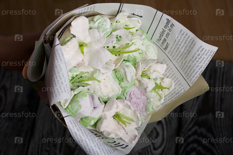 Зефирный букет в оберточной бумаге. Тюльпаны и розы из зефира. Цветочные почки и зеленые листья из зефира. Снимок крупным планом