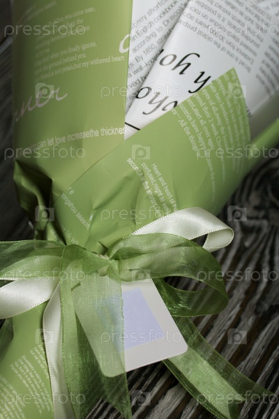 Букет в бумажной упаковке. Крафт-бумага с лентой, завязанной в виде банта. Видимый тег компании с полем для текста. Снимок крупным планом