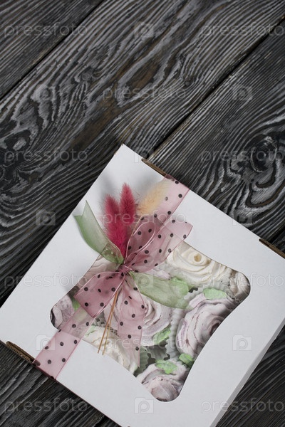 Домашний зефир в подарочной упаковке. Перевязан лентой. С веточками лагуруса. Зефир цветы. На черных сосновых досках. Взято сверху