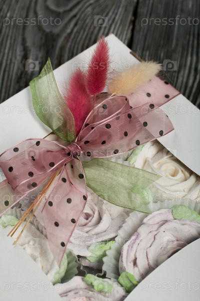 Домашний зефир в подарочной упаковке. Перевязан лентой. С веточками лагуруса. Зефир цветы. На черных сосновых досках. Крупный план