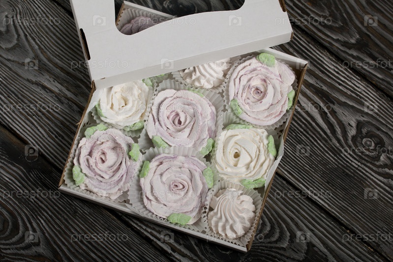 Домашний зефир в подарочной упаковке. Зефир цветы. На черных сосновых досках. Взято сверху