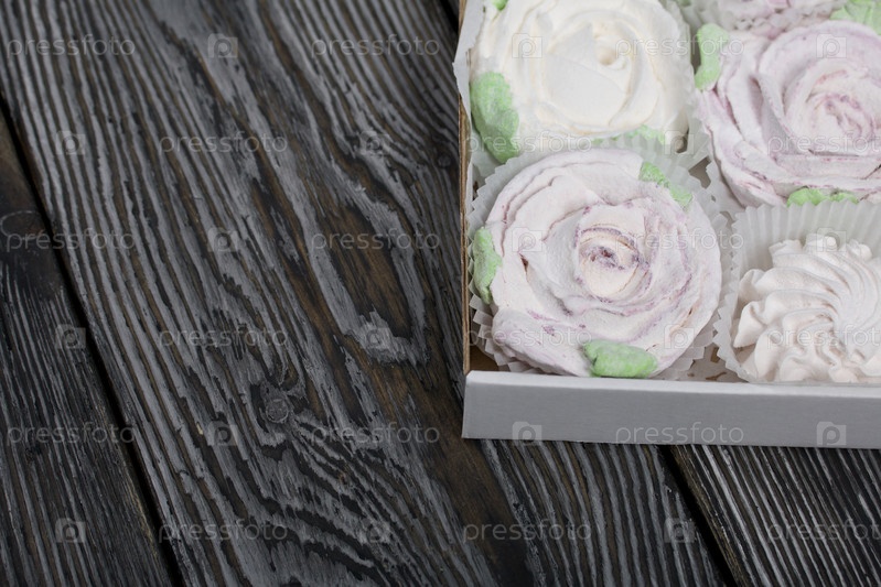 Домашний зефир в подарочной упаковке. Зефир цветы. На черных сосновых досках. Взято сверху