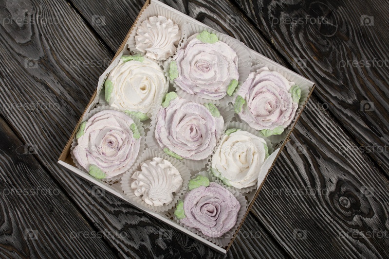 Домашний зефир в подарочной упаковке. Зефир цветы. На черных сосновых досках. Взято сверху