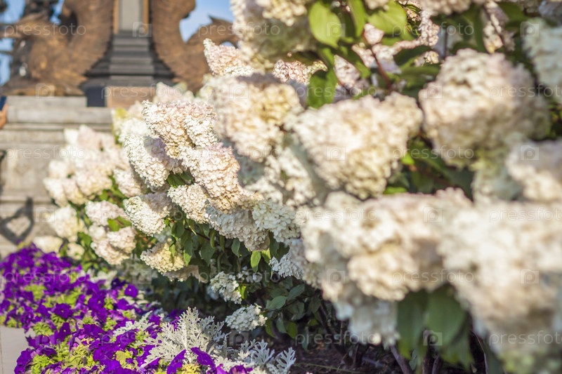 Гортензия в саду на клумбе под открытым небом. Сочное восхитительное огромное соцветие белых и розовых гортензий в саду