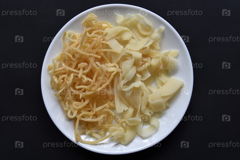 Закуска из соленых кальмаров к пиву на белой тарелке. Вкусные соломинки пряного кальмара на черном фоне