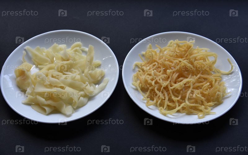 Закуска из соленых кальмаров к пиву на белой тарелке. Вкусные соломинки пряного кальмара на черном фоне