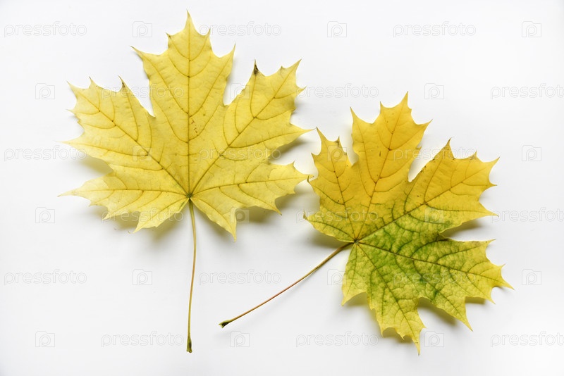 Желтые и зеленые кленовые листья на белом фоне крупным планом. Листья гербария. Красивые кленовые листья осенью