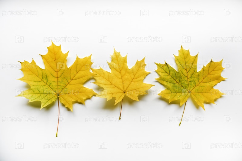 Желтые и зеленые кленовые листья на белом фоне крупным планом. Листья гербария. Красивые кленовые листья осенью