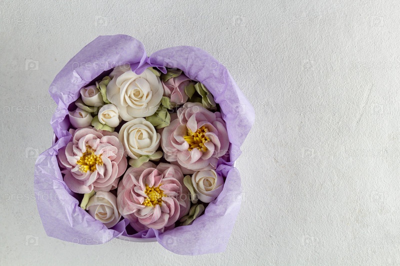 Домашний зефир в подарочной упаковке. Цветы зефира на сером фоне
