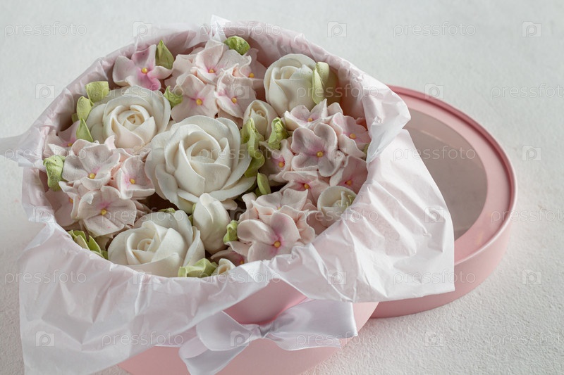 Зефирный букет цветов в розовой коробке на сером фоне